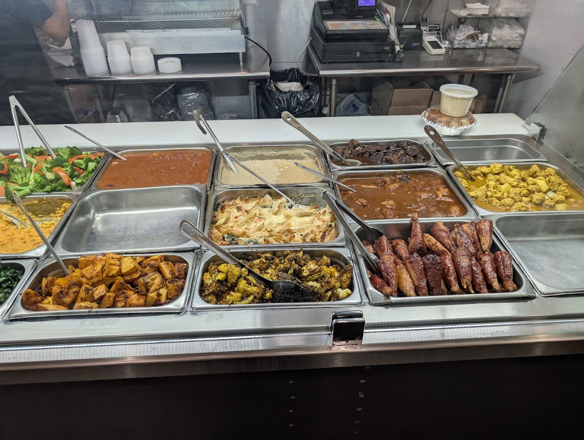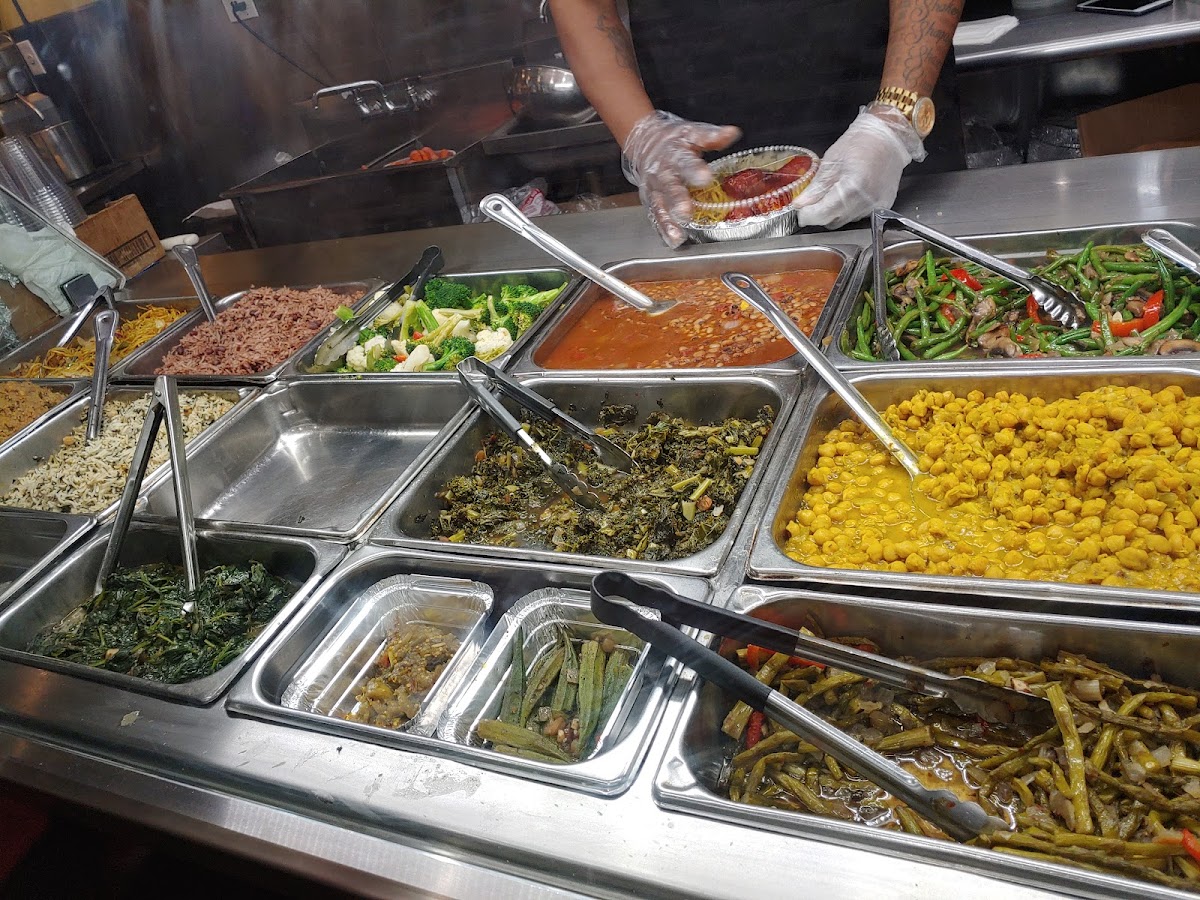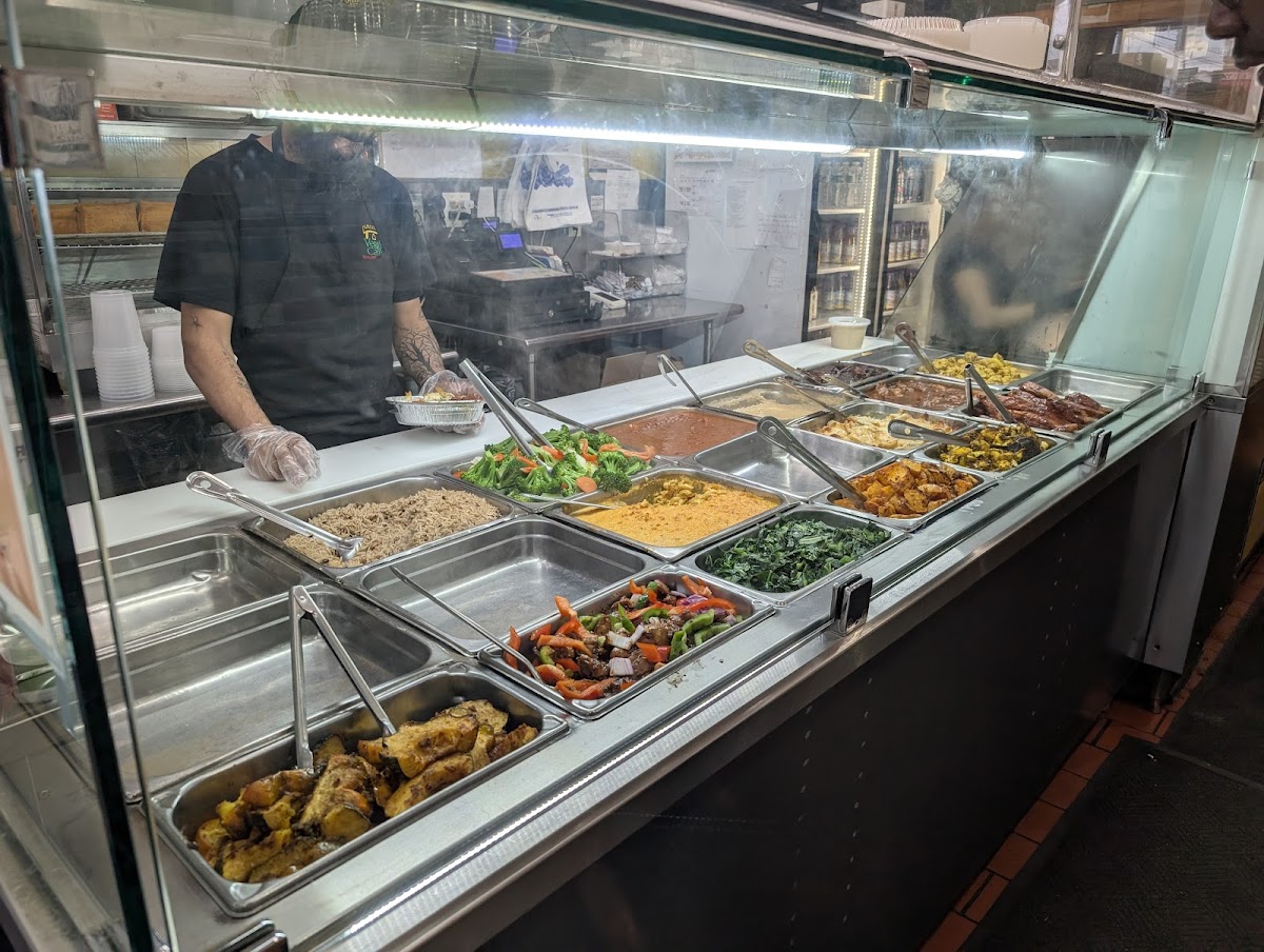 Caribbean inspired plates like rasta pasta, couscous, okra, sautéed string beans, and chicken and collard greens bring warmth and spice to the table. Even classics like chow mein and fish patties receive a thoughtful vegetarian twist that keeps flavor front and center.